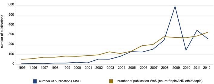 Um artigo recente mostra o crescimento das publicações sobre neuroética. Neuroética é o estudo das implicações éticas, sociais e legais dos avanços da neurociência. Veja o gráfico abaixo:
