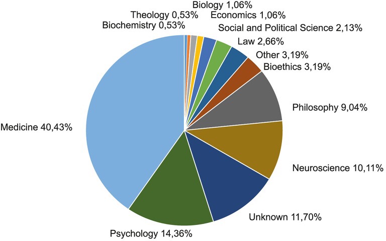 O interessante é o papel da psicologia na formação dos pesquisadores em neuroética. Veja outro gráfico: